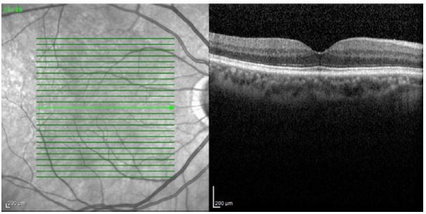 La OCT es un examen no invasivo que, haciendo uso de una luz de láser que barre el tejido retiniano permite obtener imágenes de la mácula de alta resolución y estudiar morfológicamente la retina y la coroides, pudiendo cuantificar volumétricamente su espesor en tiempo real (2).
