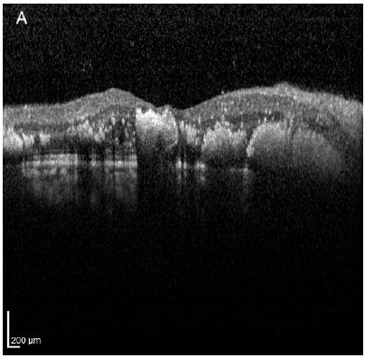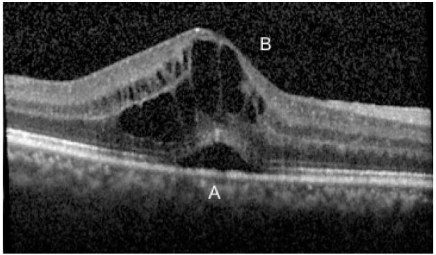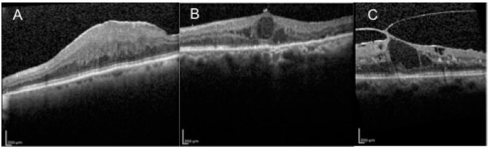 Tiene una prevalencia del 7% y se relaciona generalmente con un edema crónico. En estos pacientes la retina sensorial se eleva y los espacios quísticos confluyen. En la OCT se aprecia una acumulación oscura de fluido subretiniano que eleva la retina en forma de cúpula destacando su alta reflectividad, que representa la superficie externa de la retina desprendida y que permite diferenciar este fluido subretiniano del fluido intrarretiniano.