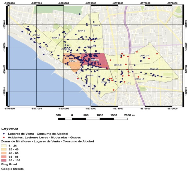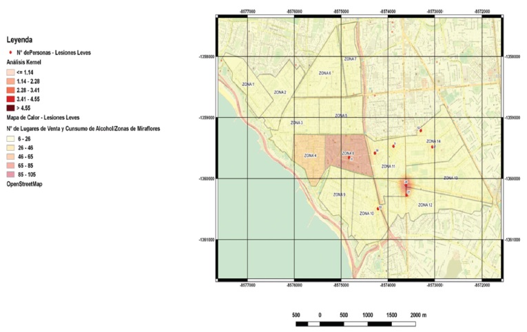 Se registraron en el distrito de Miraflores 371 locales l (con licencia municipal que se encontraban registrados en la municipalidad del distrito). Los mapas colorimétricos de las zonas con mayores puntos de venta y consumo de alcohol se muestran en la figura 1; se observa que la zona 8 del distrito concentra la mayor cantidad de locales de venta y consumo de alcohol, seguido por la zona 4. En la figura 2 se observa los mapas de calor de las zonas específicas donde se presentaron las agresiones. Se puede apreciar que las LCE leves se condensan en el cruce de dos avenidas principales, Av. Alfredo Benavides cruce con Av. República de Panamá y Av. Roosevelt (límite de las zonas 11, 12 y 13) y otras pocas en diferentes sectores, pero todas en un radio de 500 metros de distancia de las zonas con mayores puntos de venta y consumo de alcohol.