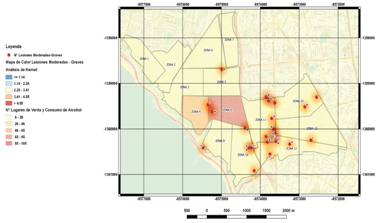 Las LCE moderadas a graves muestran que tienen diferentes ubicaciones (“puntos de calor”). La figura 3 muestra que un punto se encontró en la Calle Berlín (límite de las zonas 4 y 8), zonas marcadas como zonas con mayor punto de venta de alcohol. Otro punto se encontró cercano a la Av. Paseo de la República, próximo a la estación Benavides del servicio de metro (entre la zona 8 y 9); otro punto se localizó en la Av. Paseo de la República, cerca de la estación 28 de julio del servicio del metro (límite entre la zona 10 y 11), otros en la Av. Andrés Avelino Cáceres, zona limítrofe con el distrito de Surquillo (Zona 11 y 14) y la Av. Roca y Bologna cruce con Av. República de Panamá (zonas 11, 12 y 13) donde se observó también el mayor número de asaltos con agresiones.