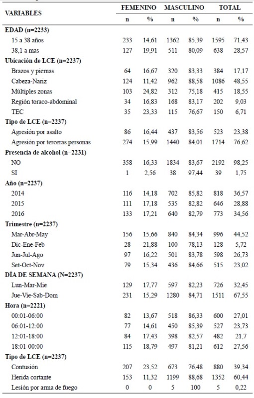 Se elaboró una base de datos en el programa MS Excel 2013, que incluyeron las siguientes variables: día y hora de ingreso, sexo, edad y distrito donde residía el afectado, la clase de accidente y lugar de ocurrencia. La edad clasificada en cinco categorías (0 a 20 años, 21 a 29 años, 30 a 38 años, 39 a 46 años, 47 a 55 años y 56 años a más) y la hora de llegada al HEJCU que se clasificó en cuatro categorías (00:01 a 06:00, 06:01 a 12:00, 12:01 a 18:00 y 18:01 a 00:00 horas). Los pacientes se agruparon en: víctimas de asalto, agredidos por peleas o grescas y los que llegaron por intoxicación alcohólica. Las LCE por lo que fueron atendidos los pacientes se clasificaron en: contusión y heridas (cortante y por arma de fuego).