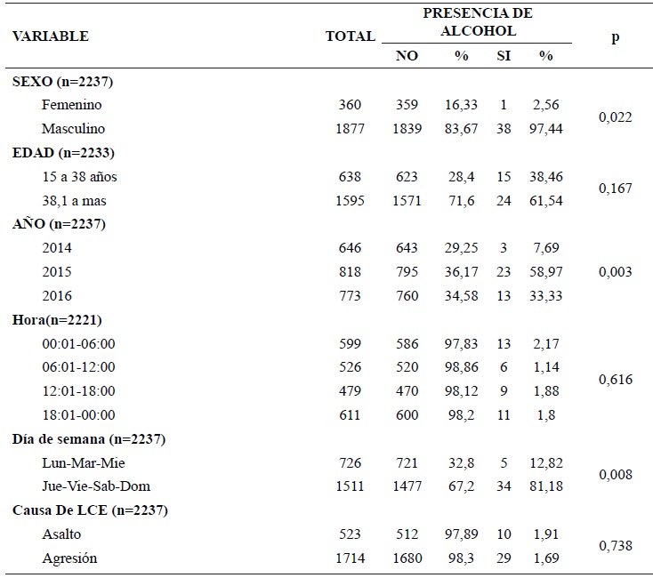 En el análisis estadístico se encontró que era más probable que un accidentado con LCE presente alcohol cuando era del sexo masculino y el evento se presentó en los años 2014 y 2016 o en los días jueves-domingo (tabla 2).