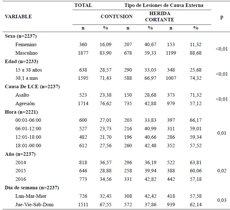 También fue más probable que un accidentado con LCE presente una contusión en vez de una herida cortante cuando se trataba de un accidentado de sexo masculino, de edades entre 15 a 38 años, la causa era una agresión, la ocurrencia del evento se producía entre las 00:00 a 18:00 horas y en los años 2014 y 2016 o entre los días jueves-domingo (tabla 3).