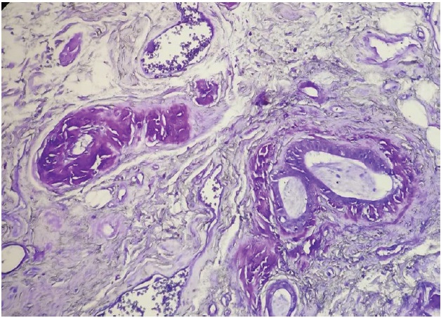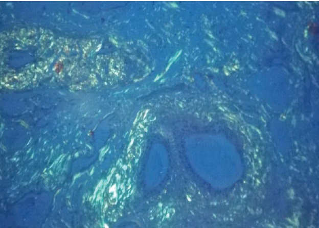 Se realizó biopsia de labio (glándula salivales menores) cuyo resultado anatomopatológico fue: lóbulos de glándulas salivales con inflamación crónica moderada y atrofia moderada, depósito de material eosinófilo perivascular compatible con amiloide; se realizó coloración Cristal Violeta (figura 2) y rojo Congo (figura 3), siendo ambas positivas para tejido amiloide.