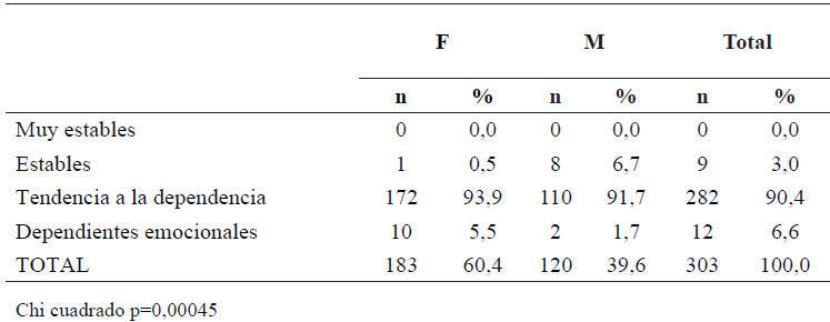 En el 90,39% de los participantes se presentó tendencia a la dependencia emocional, 6,62% dependientes emocionales, siendo más frecuente en las mujeres (tabla 1).