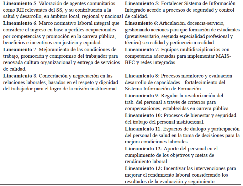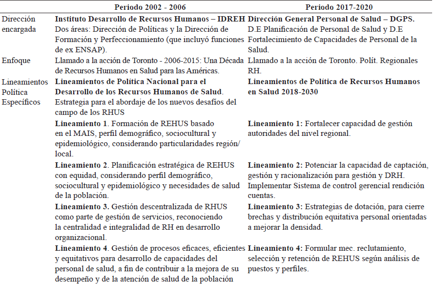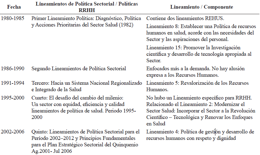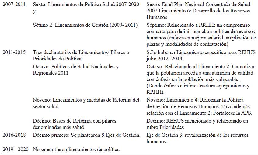 En el periodo 1980-2020, se emitieron 11 lineamientos de política sectorial – LPS (algunos llamados Pilares o Prioridades de Gestión) (15,16,17,18,19,20,21,22,23) y dos lineamentos de política específicos de recursos humanos – LE RHS (24,25); cinco de los LPS establecieron específicamente al menos un lineamiento de política en RHUS. El primero en 1980 proyectó establecer una política de RHUS, el segundo en 1991 planteó revalorizar los RHUS, el tercero en 2002, una política de gestión y desarrollo de RHUS con respeto y dignidad, el cuarto en 2007, el desarrollo de los RHUS y el quinto en 2012, reformar la política de gestión de RHUS. Los 6 restantes abordaron el tema como parte de actividades, propuestas diversas o indirectamente en otro lineamiento (tabla 1).