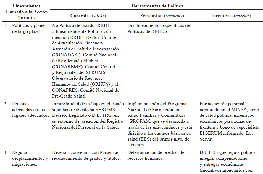 Abstract: Objective: To analyze the development of human resources policies in health in Peru. Methods: Cross-sectional analysis study of Health Human Resources Policies of the Ministry of Health. To this end, various Policy documents developed in Peru were reviewed, before and after the Toronto Call to Action and its degree of implementation, through three implementation tools: controls (sticks), persuasion (sermons) and incentives (carrots). The historical analysis considered: political action, civil society response and state adaptation. Results: 11 Sector Policy Guidelines were identified (five with a human resource guideline) and two specific Policy Guidelines by Line Directions; both groups not necessarily coincident. In its implementation, mainly control and persuasion policy tools were used, as well as mixed tools. Mostly control and persuasion policy tools (as well as mixed tools) were used. Incentives included better salaries and higher scores when applying for specialty positions; however, it presented distortions as an unsatisfactory motivator. Conclusions: no State Policy in human resources was identify (long term). The policies implemented are fundamentally sticks and sermons and had limited effect, due to high staff turnover and little participation by social actors, with the consequent weakening of initiatives. Incomplete use of incentives generated boomerang-like results. The effectiveness and sustainability require, harmony and continuity between Policies, and Management appropriates, leads and finances them, the harmonization of the three tools to their full potential.