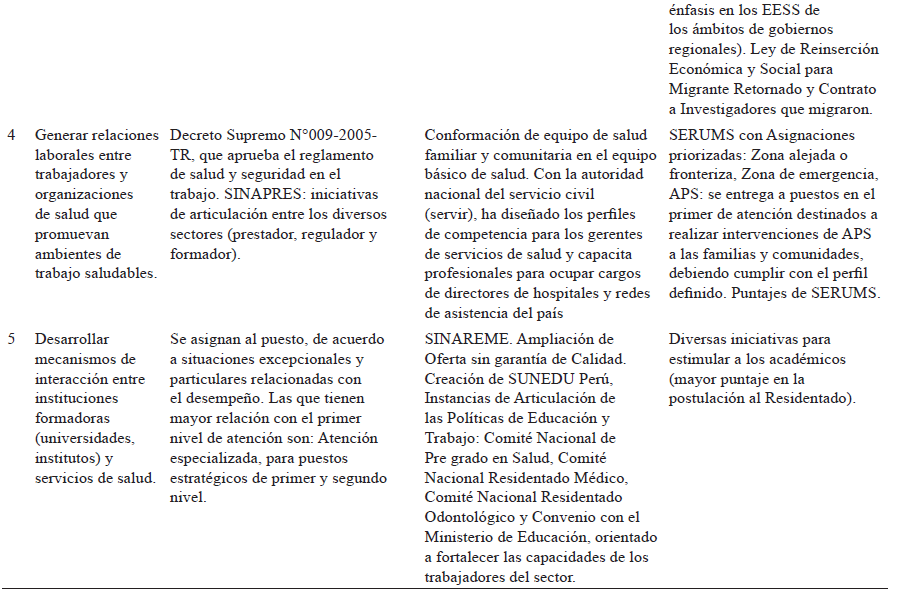 El tercero enfatizó la promoción de RHUS a través de sistema de méritos, línea de carrera, remuneraciones idóneas y fomento del desempeño. La ENSAP ente directivo de la gestión de los recursos humanos pasó a ser un organismo público descentralizado denominado Instituto de Desarrollo de Recursos Humanos (IDREH), el cual oficializó los primeros lineamientos de política específicos en recursos humanos en salud - LE RHS (tabla 2), desarrollando un plan de implementación mediante el cual se creó: El Sistema Nacional de Residentado Médico-SINAREME que integró profesiones, instituyó un sistema tripartito: reguladores (Colegio Médico, Asociación Peruana de Facultades de Medicina (ASPEFAM) y MINSA), prestadores (MINSA, ESSALUD) y formadores (universidades), conformando comités a nivel nacional y regional (26). Realizó un estudio de prioridades de especialización en Medicina. Propuso crear el Sistema Nacional de Articulación de Docencia, Servicio e Investigación en Pregrado de Salud (SINAPRES) como espacio de regulación del acceso y la gestión de los campos clínicos y planteó que el Servicio Rural y Urbano Marginal de Salud (SERUMS) asuma criterios para asignar plazas en espacios de escaso desarrollo y gran pobreza, logrando que el programa social Juntos, financie plazas (medicina, enfermería y obstetricia) destinadas a equipos de trabajo en provincias excluidas y extrema pobreza. Abordó la aprobación de una política integral de remuneraciones, desempeño y riesgo según el nivel de atención y reguló la formación de posgrado para adecuar la oferta de profesional a las necesidades del país. (27)