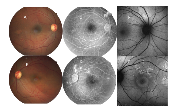 La angiofluoresceinografía retiniana mostró hiperfluorescencia por escape a través de múltiples focos en ambas retinas, en mayor número y tamaño en el OI (figura 1 (C y D)).