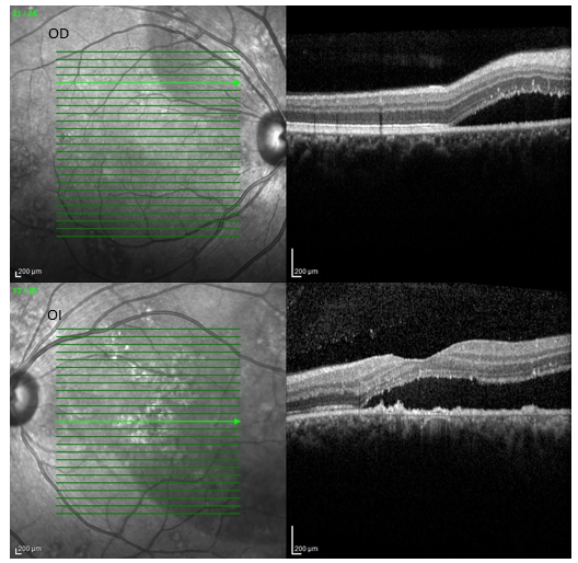 La tomografía de coherencia óptica muestra un desprendimiento de retina seroso sobre la papila del OD y en la zona central macular del OI que explica la disminución de la visión de este ojo.