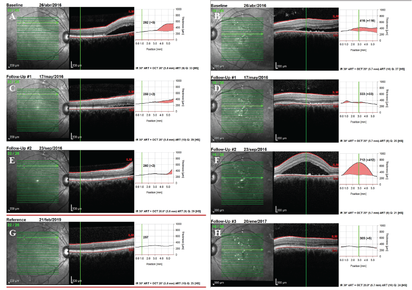 Evolución de la coroidopatía. (A y B): muestran las imágenes previas al tratamiento del OD y el OI respectivamente. (C y D): muestran la evolución satisfactoria luego de iniciado el tratamiento. (E): A los 5 meses de seguimiento se observa una discreta recurrencia en el OD que responde por completo al tratamiento, (G): no se encontró fluido en el control de los 34 meses. En el OI la evolución fue más tórpida, con una mejoría importante a los 21 días después de iniciado el tratamiento (D), pero tuvo una recurrencia importante a los 5 meses (F), que remitió completamente 4 meses después de reiniciado el tratamiento (H).