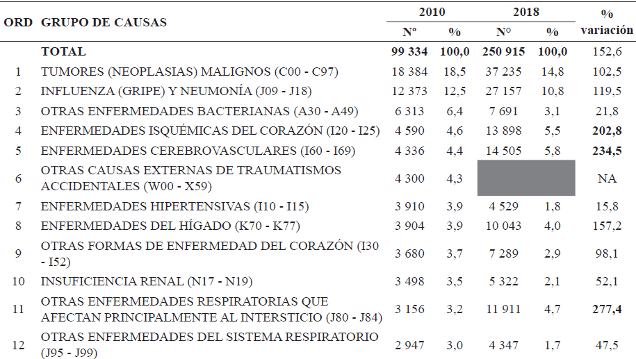 En la tabla 1 se muestra que la mortalidad general registrada en el Perú en el año 2018 fue de 250 915 personas, lo cual significó un aumento de 152% respecto al año 2010. Si bien se observa que la tasa de muertes en 2010 fue 0,38% (3,8 x mil habitantes) y en 2018 fue 0,48% (4,8 x mil habitantes), este aumento podría explicarse por un mayor registro de las muertes por parte de los profesionales médicos con el transcurrir del tiempo, o por una duplicación de información en el SINADEF y en certificados de defunción no computarizados. No obstante, según los registros oficiales se observa que las patologías que produjeron más muertes en el país en 2018 fueron las neoplasias malignas (NM) con 14,8% del total y las neumonías e influenza 10,8%. En tercer y cuarto lugar estaban las enfermedades cerebrovasculares (ECV) y las enfermedades isquémicas del corazón (EIC) con 5,8% y 5,5%, respectivamente.