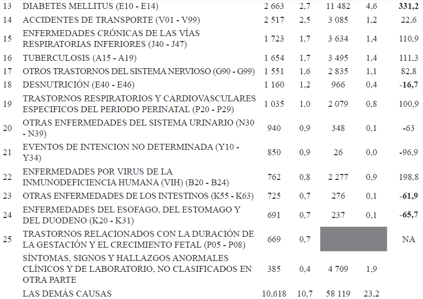 En comparación con la mortalidad en Estados Unidos en el año 2018, las patologías más frecuentes son similares a las de Perú, aunque en orden de frecuencia distinta: enfermedades cardíacas, neoplasias malignas, accidentes, enfermedades respiratorias crónicas y ECV, dejando en sétimo lugar a la diabetes mellitus y en octavo, a la influenza/neumonía (4). Por su parte, en el Cono Sur de América Latina en el 2019, las patologías más frecuentes causantes fueron la enfermedad isquémica del corazón, las ECV, las infecciones respiratorias bajas y la enfermedad pulmonar obstructiva crónica (5).