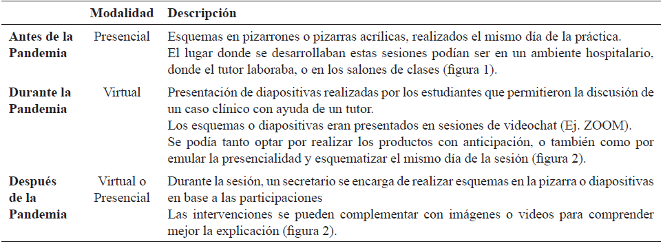 Durante la pandemia estas capacidades desarrolladas por los estudiantes también se vieron en el estudio de Goldenson et al.(8), donde se evaluó una cohorte de 111 estudiantes que realizaron una pasantía de radiología completamente virtual, donde la percepción fue positiva en un 93% y que además les ayudó a aumentar su nivel de confianza. En nuestro contexto las SGP, previa coordinación con los tutores, se realizaron en programas de videochat (ej. Zoom) (9), estas se enfocaron en la discusión en función a un caso clínico y dependía del tutor asignado si se producían esquemas o diapositivas para facilitar la integración de conceptos; por lo que, la virtualidad en ese sentido facilitó la producción de estos. Inclusive, las SGP permiten complementar las clases magistrales de la universidad y el aprendizaje de habilidades para el análisis de casos. Además, la sesión permitía a los estudiantes profundizar en un tema y enriquecer así la sesión, aunque esto no aseguró una participación equitativa (tabla 1).