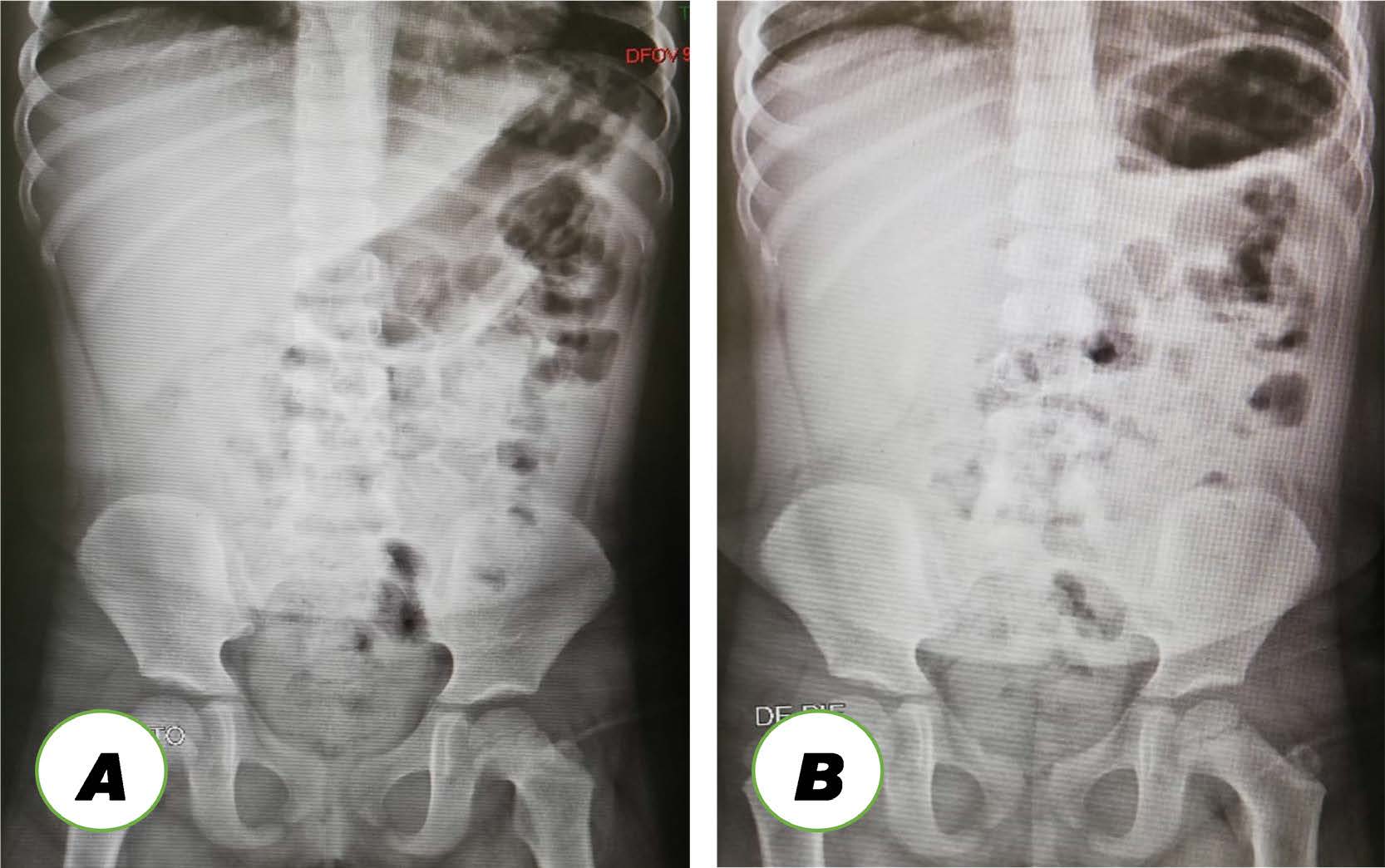 Mujer de 4 años. Preescolar. Con hospitalizaciones previas por bronconeumonía e infección de tracto urinario. Cuatro días antes de su ingreso presentó dolor abdominal, hiporexia, vómitos de contenido alimentario y sensación distérmica. En su domicilio recibió simeticona.