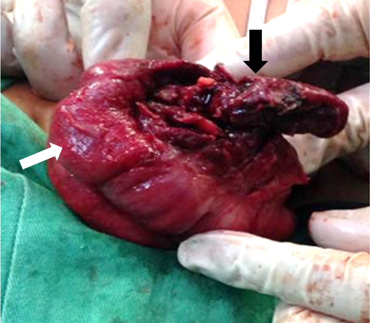 El abordaje quirúrgico fue por laparotomía exploratoria, encontrando los siguientes hallazgos: Apéndice cecal necrosado, hacia la base se observó una invaginación del segmento proximal apendicular con apariencia de masa, secreción purulenta franca aproximadamente 250 ml en fondo de saco de Douglas y coprolito libre en cavidad. Debido al hallazgo, se decidió realizar resección de la masa cecal desde 1 cm del íleon terminal a nivel de la válvula ileocecal hasta el inicio del colon ascendente, se realizó ileostomía sin fístula mucosa. El informe de anatomía patológica de la pieza operatoria fue: “Base de ciego que mide 7 x 6cm, cubierta por fibrina. Estructura apendicular necrótica que mide 4 x 1.6cm, rodeado y envuelto por mesoapendicular” (figura 3). A la microscopía: “Infiltrado inflamatorio polimorfonuclear, necrosis de mucosa y depósitos de fibrina, que va desde base del ciego hasta segmento distal apendicular”.