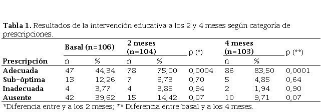 A los 4 meses post intervención educativa la prescripción adecuada fue de 83,5% siendo la diferencia con el basal, estadísticamente significativa (p=0,0001). No se encontró diferencia significativa con el basal en las prescripciones subóptima, inadecuada y ausencia de prescripción (tabla 1).