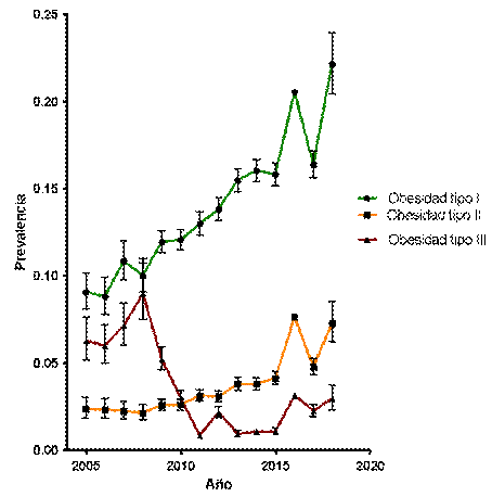Al evaluar la evolución de la prevalencia de la obesidad según grados, se observó un incremento rápido y continuo de la prevalencia de la obesidad tipo I de 9,07% (IC95% 8,09-10,16) en el año 2005 a 22,15% (IC95% 20,44-23,97) en el 2018. Igualmente se observó un aumento continuo más discreto en la prevalencia de obesidad tipo II de 2,34% (IC95% 1,84-3,05) a 7,29% (IC95% 6,22-8,54) (gráfico 1). Realizando una regresión logística se muestra un incremento en el valor de 0,9 al año para la obesidad tipo I y un aumento de 0,3 al año para la obesidad tipo II. La prevalencia de obesidad tipo III que en los años 2005-2009 estuvo en un valor de 5-6% mostró una disminución marcada en los años 2009-2011, manteniéndose en los años siguientes una prevalencia cercana al 2% (gráfico 1). La disminución de la prevalencia global de obesidad en los años 2009-2011 coincide con la caída de la prevalencia de MEF con Obesidad tipo III.