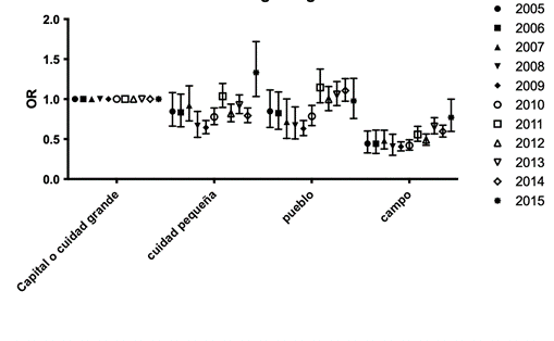 También se evidenció una diferencia significativa en el OR de las mujeres que viven en el campo frente a aquellas que viven en un centro poblado, y ciudades sean pequeñas o grandes (grafico 3).