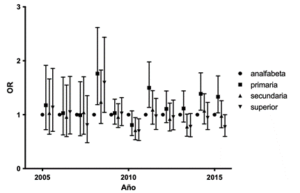 Al evaluar la prevalencia de obesidad segur lugar de residencia urbano o rural, se encontró una menor posibilidad de presentar obesidad en las mujeres que viven en áreas rurales frente a las que viven en áreas urbanas (gráfico 2). Sin embargo, el OR en el 2005 fue de 0,49 (IC95% 0,37-0,64) y 0,94 (IC95% 0,72-1,23) en el 2018.