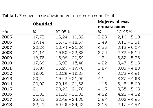 Se observó un incremento en la prevalencia de obesidad en las mujeres en edad fértil (MEF) en el periodo de tiempo 2005 al 2018, de 17,72% (IC95%: 16,24-19,32) en el 2005 a 32% (IC95%: 30,46-34,42) en el 2018. Este aumento de la prevalencia en la década observada es significativo ya que los IC95% no se sobreponen. (tabla 1). Sin embargo, se encontró una disminución transitoria en los años 2009 – 2011.