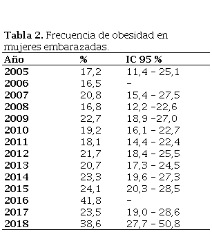 Se observó que el porcentaje de MEF obesas que se encontraban gestando al momento de la entrevista se mantiene constante, alrededor de 4% (tabla 1). Al evaluar las mujeres embarazadas de todas las MEF se encontró una prevalencia de obesidad del 17,21% (IC95% 11,42-25,10) en el año 2005, cifra que se incrementó aproximadamente en 1,3% anual, llegando a 24,12% (IC95% 20,25-28,46) en el año 2015 y a 38,61% (IC95% 27,71-50,78) (tabla 2) en el 2018.