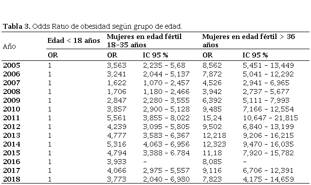 En los análisis bivariados se mostró la relación entre la obesidad en general y las variables de interés de acuerdo con el Odds-Ratio (OR) y su IC95%. Se observó que la posibilidad de padecer obesidad aumentó con la edad. En la tabla 3 se muestra el OR de padecer obesidad en las MEF de 18-35 y en las mayores 35 en comparación con las mujeres menores de 18 años. Se observó que en los últimos 3 años evaluados el grupo de las mujeres de 18-35 años presentan un OR de aproximadamente 3 mientras el grupo de las mujeres mayores de 35 años presentó valores de OR mayores de 6 en comparación de las mujeres menores de 18 años.
