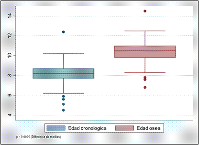 La media de la edad ósea al diagnóstico fue 10,33 ± 1,27 años. En 41 (47,7 %) de casos la edad ósea fue mayor a la cronológica en 1 a 2 años y en 45 (52,3 %) fue > 2 años. La diferencia entre las medias de la edad ósea y la edad cronológica fue 2,17 ± 0,18 años (IC 95% 1,81-2,52) (p≤0,0001) (Grafico 1).