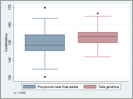 La media de la PTFA, según el método de Bayley-Pinneau, fue 149,36 ± 7,37 cm y la media de la TG, según el método de Tanner JM, fue 153,50 ± 5,15 cm. La diferencia entre las medias de la PTFA y la TG fue 4,13± 0,83 cm (IC 95% 2,47-5,80) (p≤0,0001). (Gráfico 3).