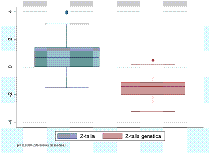 La media del Z -talla de las niñas fue 0,73 ± 1,13 DE y la media del Z-talla genética fue -1,43 ± 0,78 DE. La diferencia entre las medias del Z-talla de la niña y el Z-talla genética fue 2,16 ± 1,0 DE (IC 95% 1,94 - 2,38) (p≤0,0001) (Grafico 2).