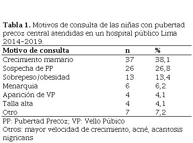 Se recopilaron datos de 86 niñas con diagnóstico de PPC. Los motivos de consulta por el cual acudieron a la UEP se muestran en la tabla 1. Las características generales de la población de estudio se muestran en la tabla 2.