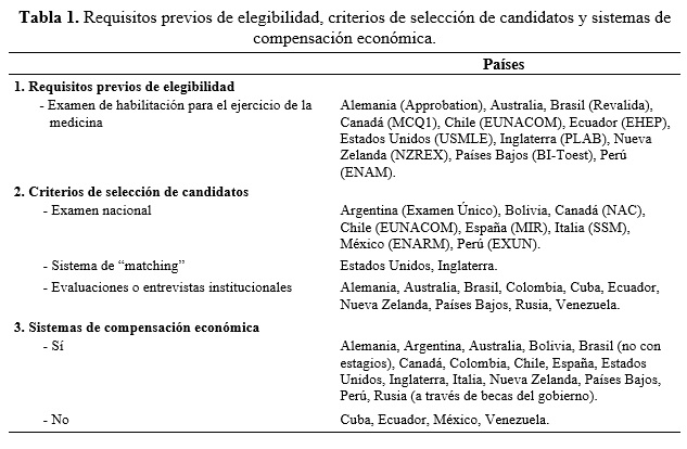 Existen diferentes opciones para los graduados médicos extranjeros latinoamericanos que emigran hacia otros países para realizar la residencia médica. En la mayor parte de los países analizados se realiza exámenes para el ejercicio de medicina y, con excepción de 4 países, existen sistemas de remuneración económica. Las modalidades de ingreso a los sistemas de residencia van desde exámenes nacionales de opción múltiple modalidad escrita o basados en computadora, sistemas de “matching” en los que además de la realización de exámenes cobra mucha importancia el desempeño académico y profesional y sistemas basados en evaluaciones o entrevistas institucionales.