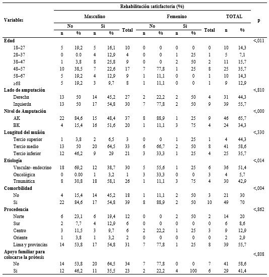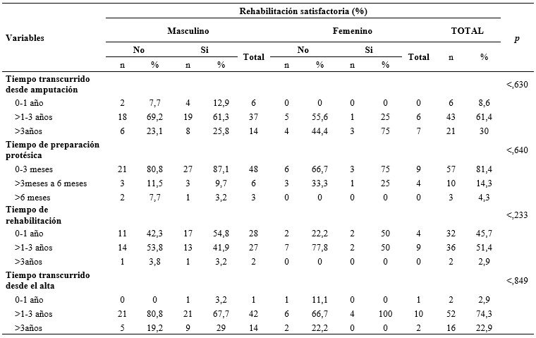 De los 70 pacientes con amputación de miembro inferior el 81,42% fue de sexo masculino cuya edad media fue 48,7 ± 15,19 años en el rango predominante de 48 a 57 años, los otros aspectos sociodemográficos y clínicos según la rehabilitación satisfactoria y sexo, se muestran en la tabla 1.