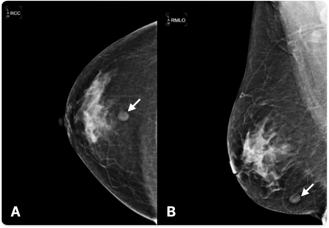 Abstract: We report the case of a 46-year-old woman with no previous history who was attended for screening. Mammography revealed an ovoidal nodule of mixed density with well-defined borders in the right breast that had positive flow at the Doppler examination, highly suspicious of malignancy. An ultrasound-guided biopsy was performed, revealing neoplastic vascular proliferation compatible with low-grade angiosarcoma. A total right mastectomy was performed, and the patient is under follow-up evaluation with no evidence of recurrence. This report highlights the clinical presentation of an infrequent malignant breast neoplastic condition where the combination of images makes the diagnosis.
