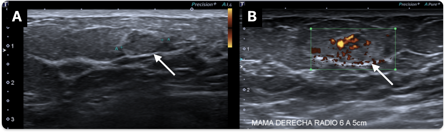 Resumen: Se reporta el caso de una mujer de 46 años sin antecedentes de importancia, quien acudió a tamizaje. En la mamografía se evidenció la presencia de nódulo ovoideo de densidad mixta hipo e isodenso de márgenes circunscritos en mama derecha, el estudio ecográfico mostró nódulo isoecoico levemente heterogéneo de márgenes parcialmente circunscritos, con flujo presente al Doppler Power, hallazgos de características sospechosas. Fue sometida a una Biopsia Core con guía ecográfica, el resultado anatomopatológico mostró proliferación vascular neoplásica compatible con Angiosarcoma de bajo grado. A la paciente se le realizó una mastectomía total derecha, actualmente la paciente se encuentra en controles anuales, sin evidencia de recidiva. El reporte muestra una presentación poco frecuente de una neoplasia maligna de mama, donde fue clave la combinación de distintos métodos de imagen, para la sospecha y diagnóstico posterior.