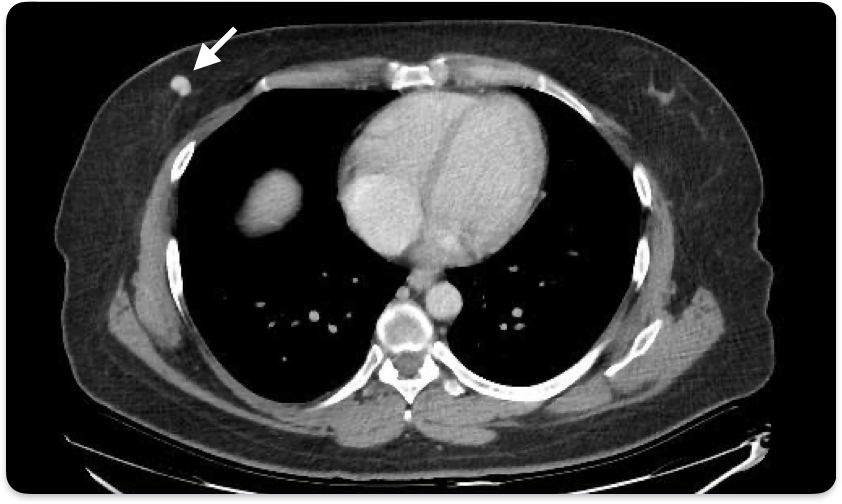 En este reporte, la paciente era una mujer de 46 años, cuya edad es acorde con la edad promedio de presentación (3). Dentro de las características clínicas, los angiosarcomas pueden manifestarse con coloración dérmica azulada o morada y engrosamiento dérmico, causados por la naturaleza vascular de la lesión (3), siendo los evidentes cambios dérmicos el tipo de presentación más frecuente debido a su alta tasa de crecimiento (5). La paciente no presentó manifestación dérmica, lo cual se explica en parte por el tamaño de la lesión (menor a 5 cm), siendo el tamaño un factor pronóstico en esta patología (4). Cabe resaltar que esto no es absoluto, ya que algunos angiosarcomas menores de 5cm, pueden manifestar recurrencia local temprana de la enfermedad. (6)