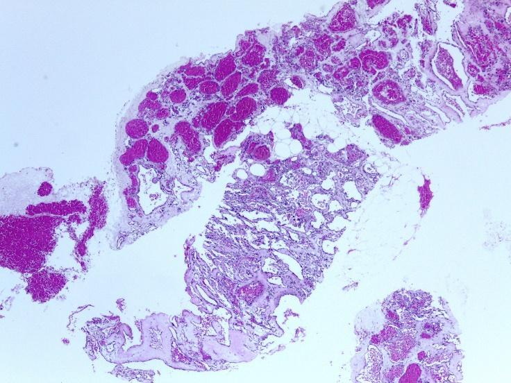 Según la última publicación de la WHO (11), macroscópicamente son tumores generalmente hemorrágicos, difusos o nodulares, profundos en localización. Varían en tamaño de 7 mm a 25 cm. Pueden ser relativamente circunscritos o pobremente definidos en bordes. Los bien diferenciados son hemorrágicos y esponjosos; los pobremente diferenciados son sólidos, carnosos, pardo claros con áreas de necrosis, pudiendo mostrar áreas quísticas. El caso presentado era de aspecto hemorrágico, bien delimitado, aunque microscópicamente se difundía a través del tejido adiposo adyacente.