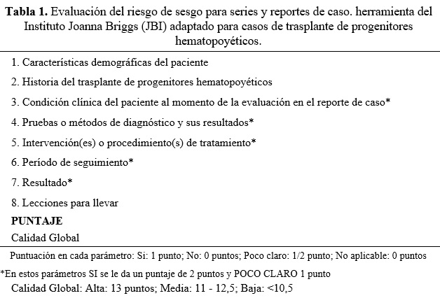 Inicialmente, las RS de reportes de caso realizaban esta evaluación mediante el cumplimiento de las listas de verificación como la declaración CARE o más recientemente la lista de verificación del Joanna Briggs Institute (5). Vinagre et al. (5) adaptaron a este último las recomendaciones de Hassan-Murad, creando una lista de verificación más completa con un sistema de puntuación adaptable a los objetivos de la revisión (tabla 1).