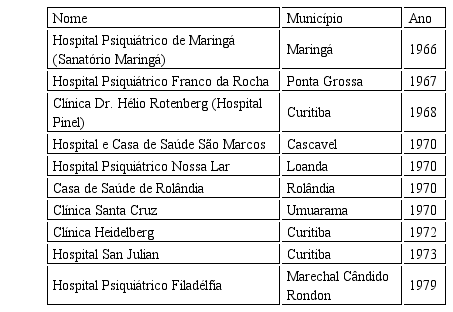 Pode-se visualizar a aceleração do processo de privatização da assistência psiquiátrica no Paraná através da relação de alguns hospitais e clínicas especializados particulares fundados entre os anos 60 e 70, em contraste com o longo período anterior no qual registra-se a existência de apenas três hospitais psiquiátricos no estado: