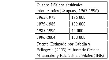 La emigración internacional es una tendencia estructural de la población uruguaya desde mediados del siglo XX. Desde 1963, el saldo migratorio del Uruguay es negativo, lo que equivale a decir que los emigrantes superan en número a los inmigrantes, estimándose en alrededor de doscientos mil en el primer período (1963-1975), cerca de ciento ochenta mil en el segundo (1975-1985) y casi cien mil en el último período intercensal (1985-1996). En definitiva, a pesar de que se redujo el número de emigrantes, particularmente en el último tramo intercensal, el período en su totalidad (1963-1996) se caracterizó por una tendencia sostenida a la pérdida de población.[1] Aún cuando hubo ingresos debidos al retorno característico de toda corriente migratoria, en todos los tramos intercensales la emigración fue el fenómeno dominante, aún en el período cercano a la reinstalación del sistema democrático, que implicó el regreso al país de los exiliados políticos. Finalmente para el último período intercensal 1996-2004 el saldo migratorio también fue negativo, ubicándose en torno a las cien mil personas. Ver cuadro I.