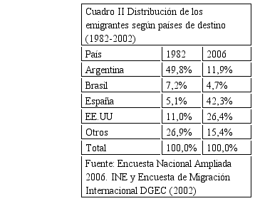Según el cuadro II los destinos de emigración cambiaron, mientras que para el primer período (1982), alrededor de la tercera parte de los uruguayos en el exterior reside en la República Argentina, siendo ésta la principal colonia. Esta situación se revierte en el período siguiente donde aproximadamente el 70% residen en los Estados Unidos y en España. Brasil si bien disminuyó en porcentaje entre ambos períodos, mantiene su importancia como colonia y una fluida comunicación con su país de origen, como veremos más adelante.
