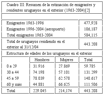 Es sabida la dificultad para estimar con precisión el número de emigrados, la mayor parte de los datos citados provienen de la Unidad Multidisciplinaria de la Facultad de Ciencias Sociales de la República, en base a los Censos Nacionales (datos del INE, Instituto Nacional de Estadísticas) y la Encuesta de Caracterización Social realizada en 2002, a los que se unen, para el período reciente, los datos estadísticos de los flujos de pasajeros en el Aeropuerto Internacional de Carrasco, que por ser el único aeropuerto internacional y por las preferencias de destino emigratorio provee información más o menos fidedigna. Ver cuadro III.