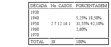 As práticas criminais estudadas foram estupro e atentado violento ao pudor, referentes aos artigos 213 e 214 do Código Penal de 1940 e aos artigos 268 e 266, nos casos anteriores a 1939. Os 38 casos foram separados de um total de 250 relativos a crimes sexuais na Londrina desse período, representando, assim, aproximadamente 15% do total. No quadro abaixo, podemos ver a porcentagem dos casos de violência contra menores em relação à quantidade apurada em cada década.