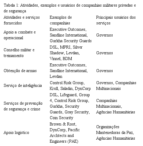 Carlos Ortiz, pesquisador do Centre for Global Political Economy da Universidade de Sussex, destaca que o clímax do debate sobre as companhias privadas foi atingido no Reino Unido com o lançamento do Green Paper (documento de consulta produzido pelo Parlamento para discussão de novos projetos de lei[12]) Private Military Companies: Options for Regulation, divulgado em fevereiro de 2002. Neste estudo, exigido pelo Comitê de Assuntos Externos da Câmara dos Comuns (House of Commons) como subsídio para uma nova proposta regulatória, destaca-se o fato de que Estados e organizações internacionais estão se voltando para o setor privado como uma forma eficiente em termos de custos de procurar serviços, os quais foram anteriormente de preservação exclusiva militar. Com base em dados da ONG International Alert de 1999, o estudo discutido no parlamento britânico aponta que atividades de companhias militares privadas ocorreram em Caxemira, Afeganistão, Libéria, República Democrática do Congo, Angola, República do Congo, Serra Leoa, antiga Iugoslávia, Etiópia e Eritreia (fronteira com Sudão), dentre outros. Baseado numa pesquisa prévia de Kevin O’Brien e David Shearer, o Green Paper apresenta uma tabela de exemplos de atividades de companhias militares privadas: