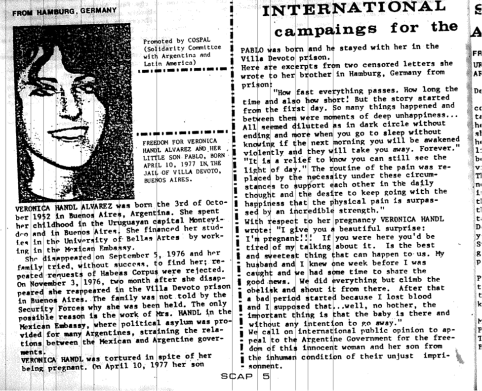 La dénonciation suivante concerne une femme, Veronica Handl, torturée alors même qu'elle était enceinte, Cette dénonciation exige sa libération et celle de son fils , Pablo, qui serait né en prison, en 1977, en Argentine. Tout le discours renvoie à un ton ému, qui invoque l'injustice de la prison et les conditions inhumaines de son emprisonnement : « nous invitons l'opinion publique internationale à demander au gouvernement argentin la liberté de cette femme innocente et de son fils, (qui souffrent) des conditions inhumaines de leur injuste emprisonnement” (traduction libre).