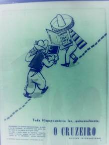 O objetivo de concorrer com as americanas Seleções e Life, mais especificamente com esta última, é citado por Paleólogo (1960, p.17). Para o autor, eles tiveram “coragem de exportar, sob a forma da revista, o seu pensamento e a sua concepção filosófica de vida” . Segundo a avaliação feita pelo autor, devido aos nacionalismos dos países latinos, seria prudente evitar a propaganda excessiva do Brasil. Avaliava, ainda, que havia um desconhecimento mútuo entre o Brasil e os países hispânicos, mas havia também um interesse desses países pelo Brasil.Para o autor, entre os Estados Unidos e o Brasil, “ao sul, evidentemente, estava situado o país amigo, o aliado desinteressado, a nação que pelo tamanho e pelas suas possibilidades de progresso, estava destinada a estabelecer o equilíbrio de influências na América” [...] “assumia o novo papel no novo contexto” (PALEÓLOGO, 1960, p. 30). Esta concepção é simbolizada na imagem publicitária (Fig. 1), veiculada nas primeiras edições da revista. Nela, o Brasil aparece na parte superior da imagem apoiando os demais países da América Latina, intermediado pela revista O Cruzeiro. Na imagem, que representa o mapa da América, o Brasil parece ocupar o espaço dos Estados Unidos.