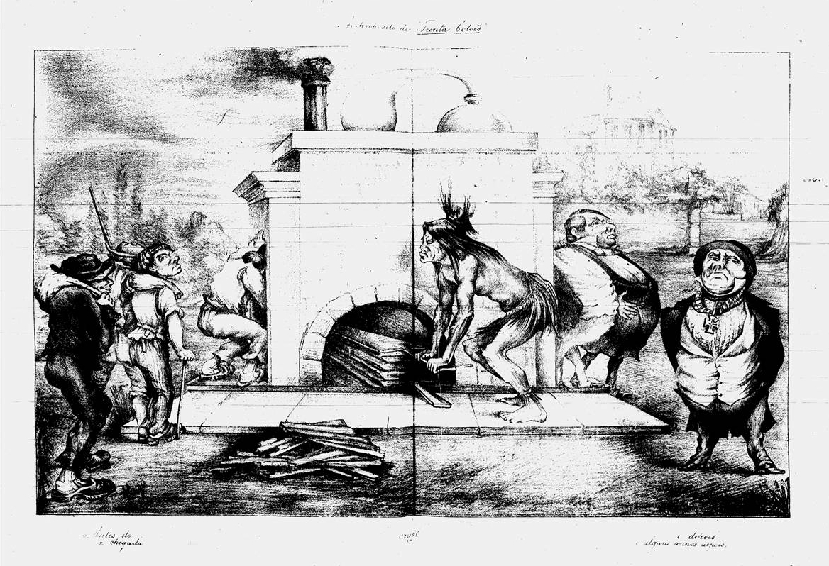 Mesmo que sua força esteja a serviço dos interesses portugueses, o índio não se curva, não abaixa a cabeça, mas os encara bravamente. O índio alimenta/mantém aceso o fogo e o imaginário do final do império. Há uma tentativa de sintetizar a história do país marcada pela exploração estrangeira e pela sobreposição dinâmica de dimensões espaço-temporais – natureza/civilização, passado/presente, pobreza/riqueza. A legenda reitera a passagem temporal, localizando como os portugueses chegam (antes) e como ficam alguns anos depois. As ambiguidades da caricatura tornam possível pensar a nação como a máquina ou uma fábrica que alimenta/engorda/enriquece os portugueses ou o índio como o povo do Brasil que produz energia e faz movimentar a riqueza sem se beneficiar dela.
