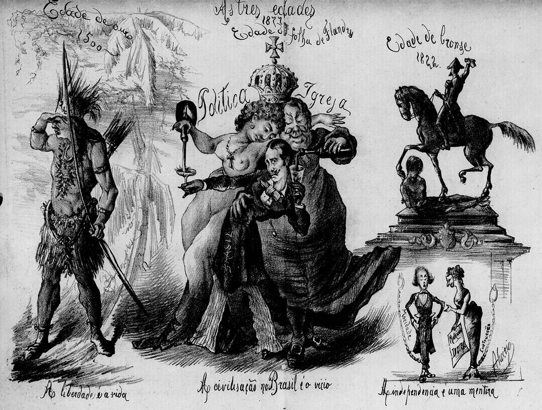 A imagem central remete ao presente, o ano de 1877, denominada Idade da Folha de Flandry [4]. A opulência da política e da igreja (representada pela caricatura do cônego José Gonçalves Ferreira, diretor de O Apóstolo, um influente periódico católico), ressalta a magreza do homem em cuja roupa elegante e na moda lê-se “Brasil”. A política, representada como uma prostituta, jovem e bem nutrida, sinuosa e sensual, adornada apenas por um crucifixo, serve ao “Brasil” mais uma taça, em um gesto simultâneo ao do padre. A postura do país é forçada, toda torta, em ângulos, vergada. Trata-se de uma trindade em festa, animada, bem ao gosto do traço anticlerical. O enunciado verbal “A civilização no Brasil é o vício” reforça não apenas a imagem, mas reitera a ideia romântica da “idade anterior”, de que os brasileiros só seriam livres no mundo idealizado dos nativos, longe da civilização europeia.