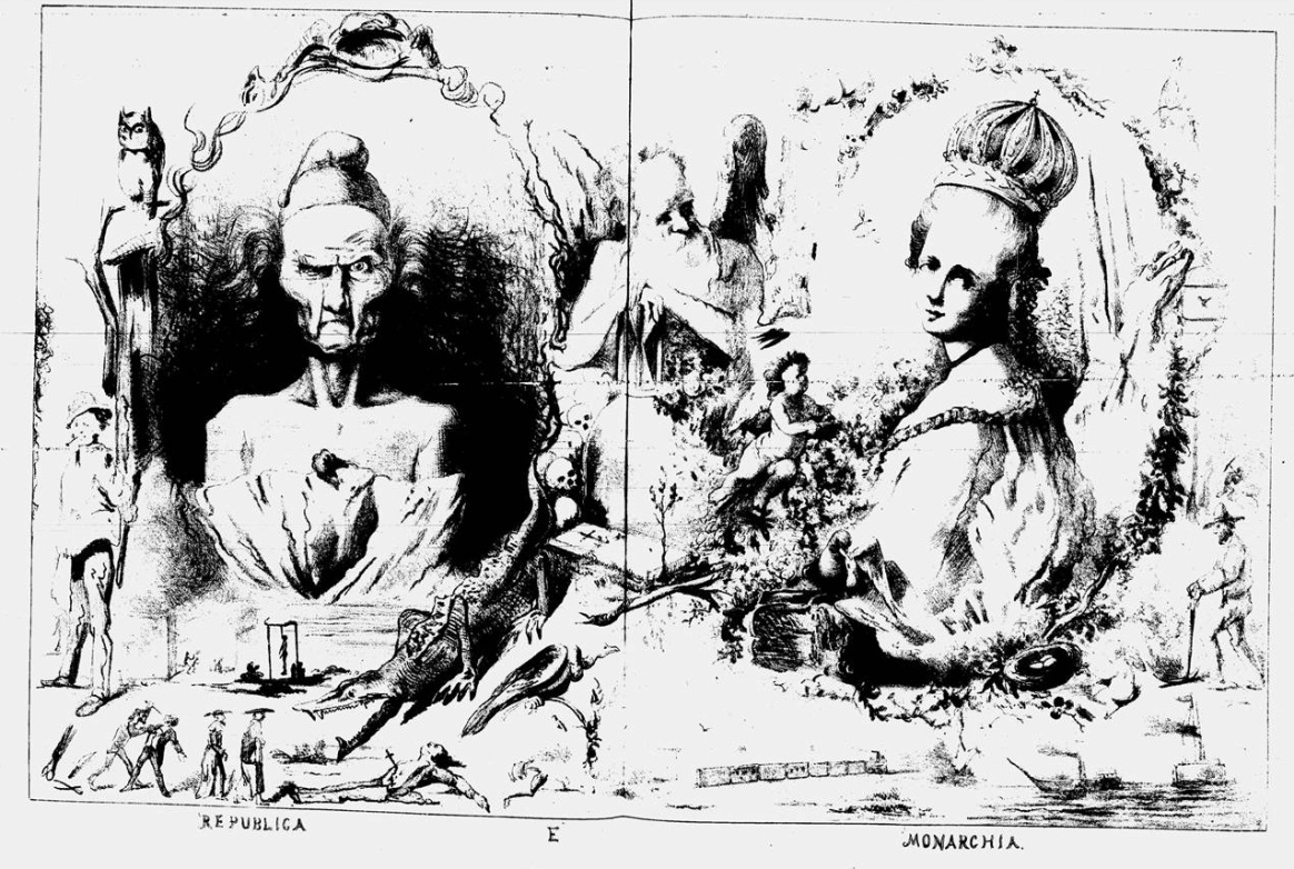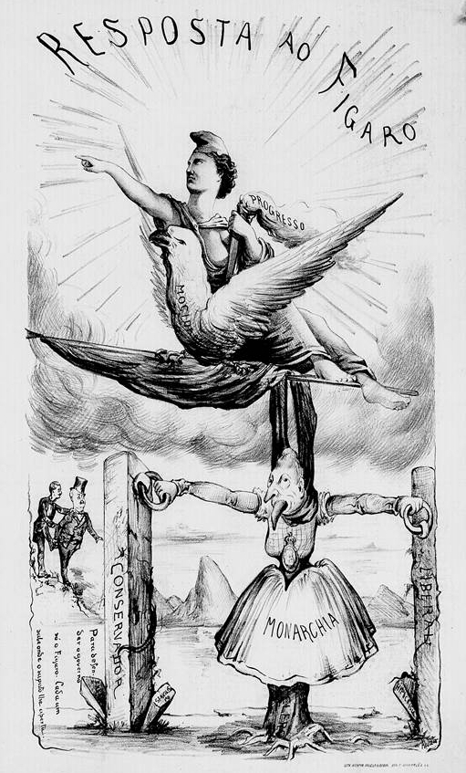 A preocupação com os rumos da nação e o futuro da monarquia provocou muitos debates na imprensa e as caricaturas tentavam traduzir visualmente as críticas e os ideais republicanos, resultando em batalhas de representações, atravessadas pelas ambiguidades e contradições do próprio período. Luciano Magno (2012, p. 328) aponta um bom exemplo disso ao lembrar a resposta de O Mequetrefe a uma caricatura publicada em O Fígaro.