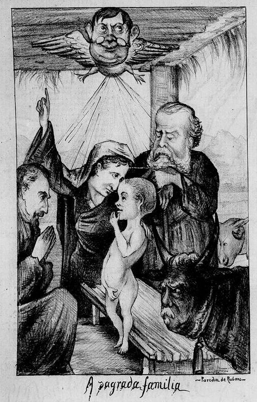 Outra imagem que estabelece um trânsito entre o sagrado e o profano é apresentada como uma “paródia de Rubens”. Aluísio Azevedo ironiza simultaneamente o império, a família imperial, as cenas bíblicas, a igreja e a própria arte. Inspira-se em uma cena de Rubens para questionar o espaço do sagrado e, ao mesmo tempo, criticar as várias fotografias da família real que circulavam no segundo império. “Como crônica visual, a caricatura também faz uso de imagens correntes na cultura visual estabelecida, colocando imagens conhecidas em diálogo” (KNAUSS, 2011, p. 11).